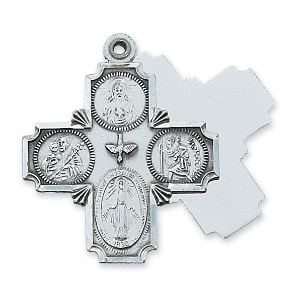 STERLING SILVER 1-1/8" 4-WAY MEDAL WITH SLIDE. INCLUDES 24" RHODIUM PLATED CHAIN AND DELUXE GIFT BOX.