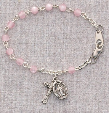 5 1/2" PINK BABY BRACELET. 4MM GLASS PEARL BEADS. PEWTER CRUCIFIX & MIRACULOUS MEDAL. DELUXE GIFT BOX INCLUDED.