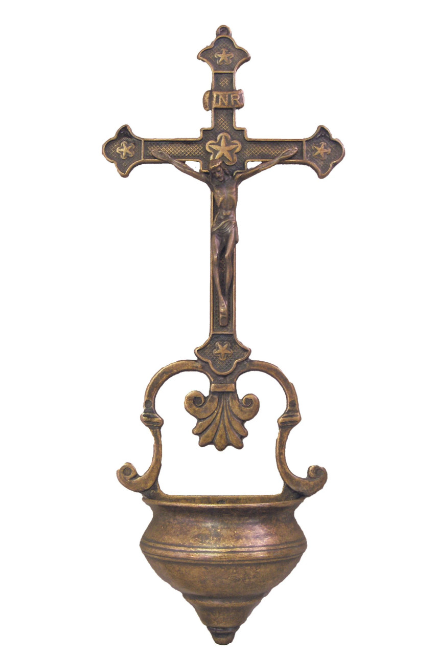 The central figure of Christ on the Cross is depicted with reverence, grounding your home in the central mystery of the faith. The font features a generously sized basin at the foot of the cross, inviting you and your guests to pause and bless yourselves with holy water upon entering or leaving.