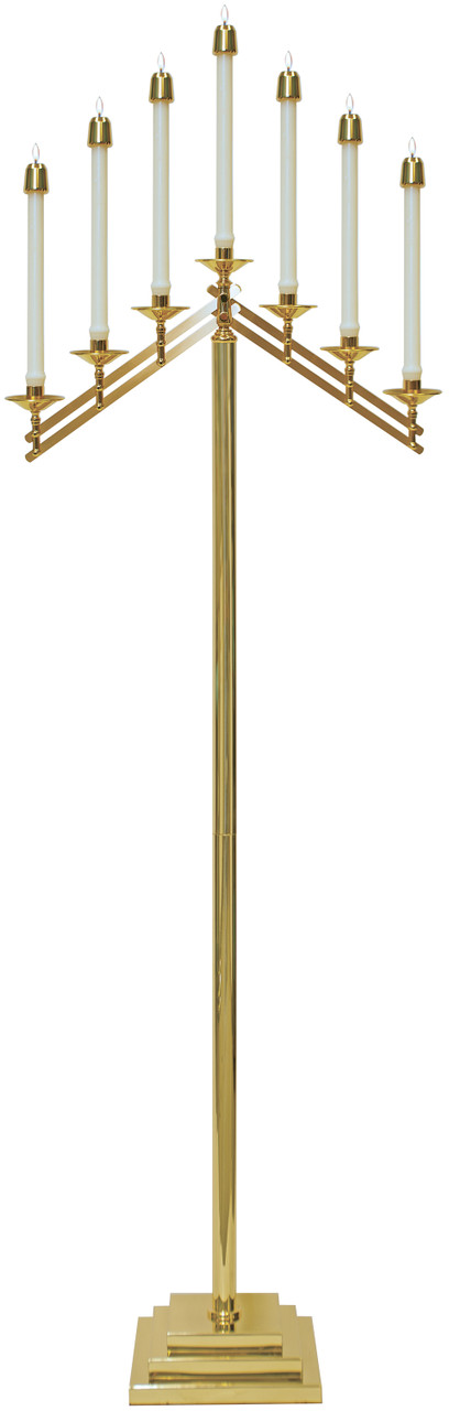 Polished brass or nickel-plated. 7-light with 10" 3 step base. 60˝H., adjustable arms, 7⁄8˝ sockets. Candles not included.