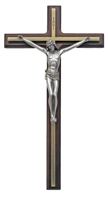 Crucifix with a wood cross and a gold-colored metal cross on top. Pewter style resin corpus with gold trim, 10.5”