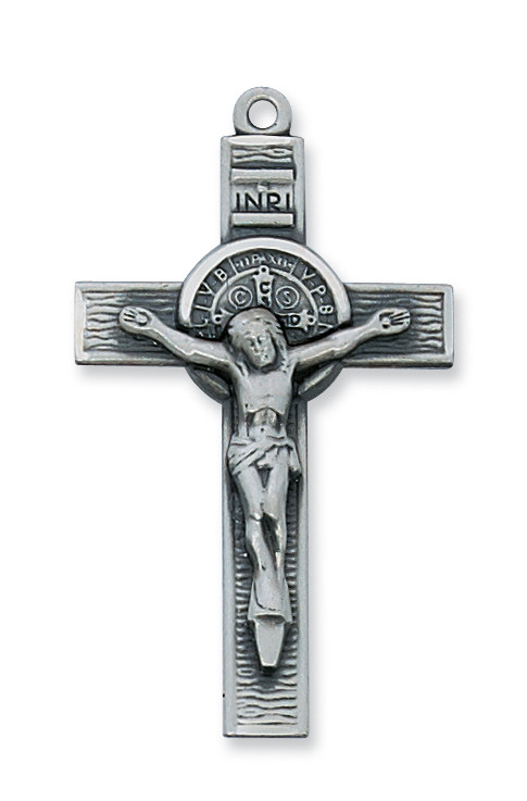 DELUXE SATIN SILVER FINISHED PEWTER 1-5/8" ST. BENEDICT CRUCIFIX, 24" CHAIN & GIFT BOX