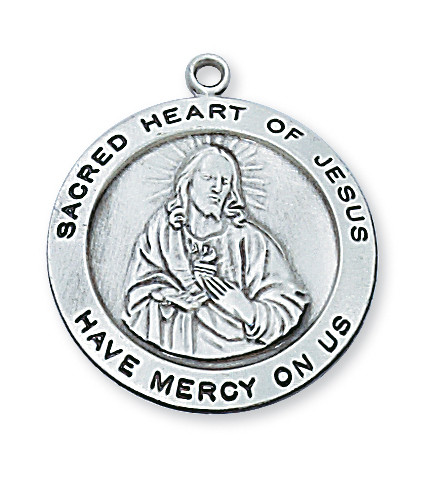 STERLING SILVER 15/16" SACRED HEART OF JESUS MEDAL. INCLUDES 24" RHODIUM PLATED CHAIN AND DELUXE GIFT BOX.