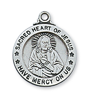STERLING SILVER 3/4" SACRED HEART OF JESUS MEDAL.  INCLUDES 20" RHODIUM PLATED CHAIN AND DELUXE GIFT BOX.