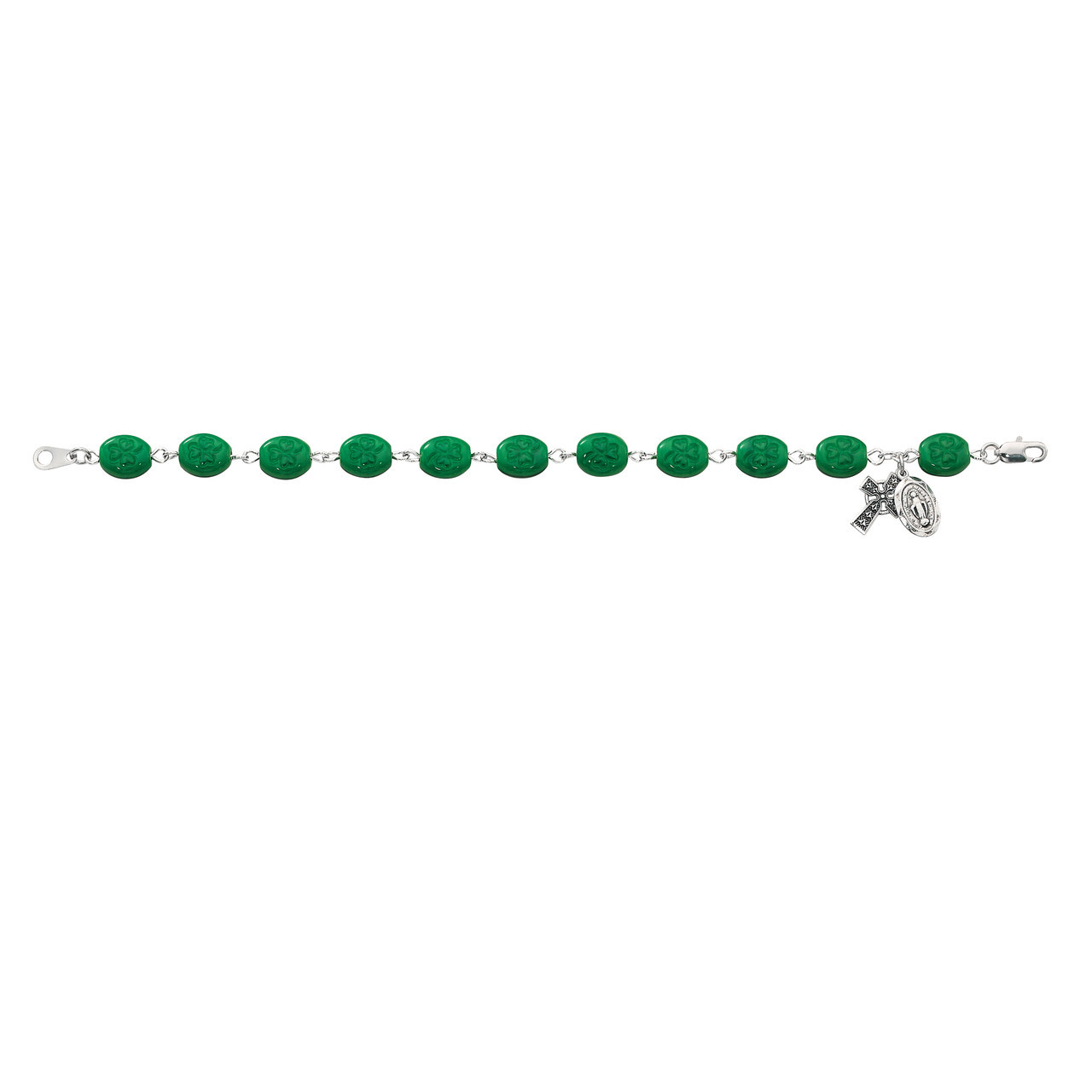 This Shamrock Rosary Bracelet beautifully reflects Catholic faith and Irish tradition. Featuring oval glass beads accented with shamrocks, it includes a detailed pewter Celtic Cross and a Miraculous Medal, creating a meaningful and symbolic design rooted in devotion.