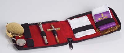 4" x 6" leather zipper case, gold pyx (2-1/8" dia., 7 host cap.), 1" dia. oil stock with ring, 3-5/8" sprinkler, 3-1/8"H. crucifix, 66" x 2" stole, purificator, finger cloth.