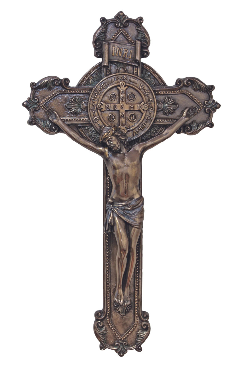 Featuring the St. Benedict Medal at its center, this crucifix reflects a deep spiritual tradition associated with protection and strength in faith. It is available in your choice of cold-cast bronze for a classic, understated look or a fully hand-painted color option that brings the details of the crucifix to life with rich, reverent artistry.