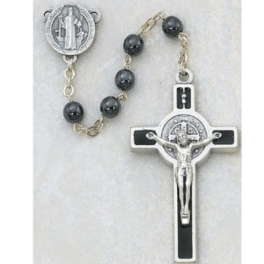 IMPORTED ST. BENEDICT HEMATITE ROSARY 6MM WITH ENAMELED CRUCIFIX & SILVER OX CENTER. INCLUDES A PLASTIC GIFT BOX.