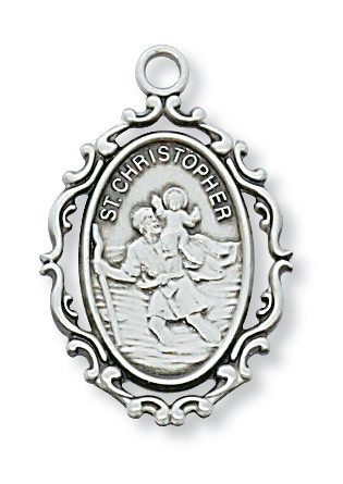 STERLING SILVER 7/8" ST. CHRISTOPHER MEDAL. INCLUDES 18" RHODIUM PLATED CHAIN AND DELUXE GIFT BOX.