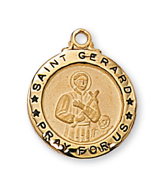 GOLD PLATED STERLING SILVER 5/8" ST. GERARD MEDAL. INCLUDES 18" GOLD PLATED CHAIN AND DELUXE GIFT BOX.