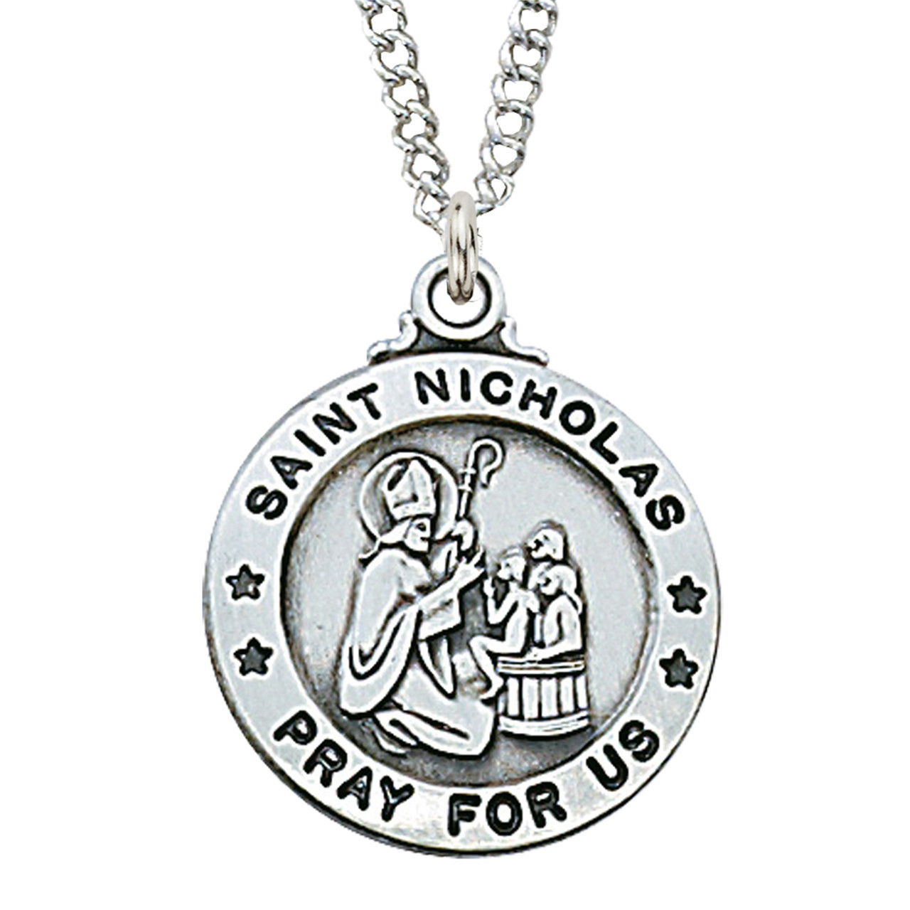 Honor St. Nicholas, beloved bishop and patron saint of children, sailors, merchants, and pawnbrokers, with this sterling silver medal necklace. The ¾" detailed medal features traditional imagery associated with his generous spirit and care for those in need, making it a meaningful piece to wear as a reminder of kindness, charity, and faithful witness.