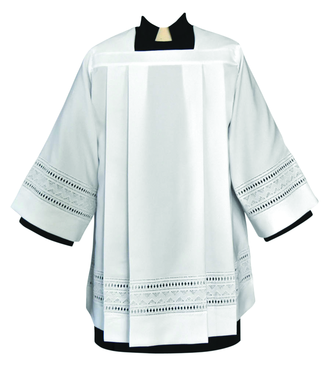 Tailored priest surplice made of embroidered eyelet applied directly to the fabric.