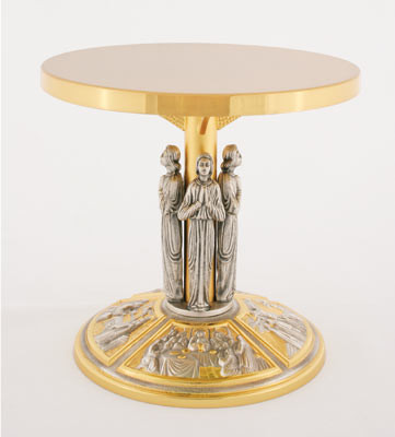 Standing at 9-1/2" in height, this pedestal offers significant elevation for the monstrance. The 9-1/2" diameter table is finished in high-polish gold, providing a perfectly sized and radiant surface for most standard and cathedral-sized monstrances.