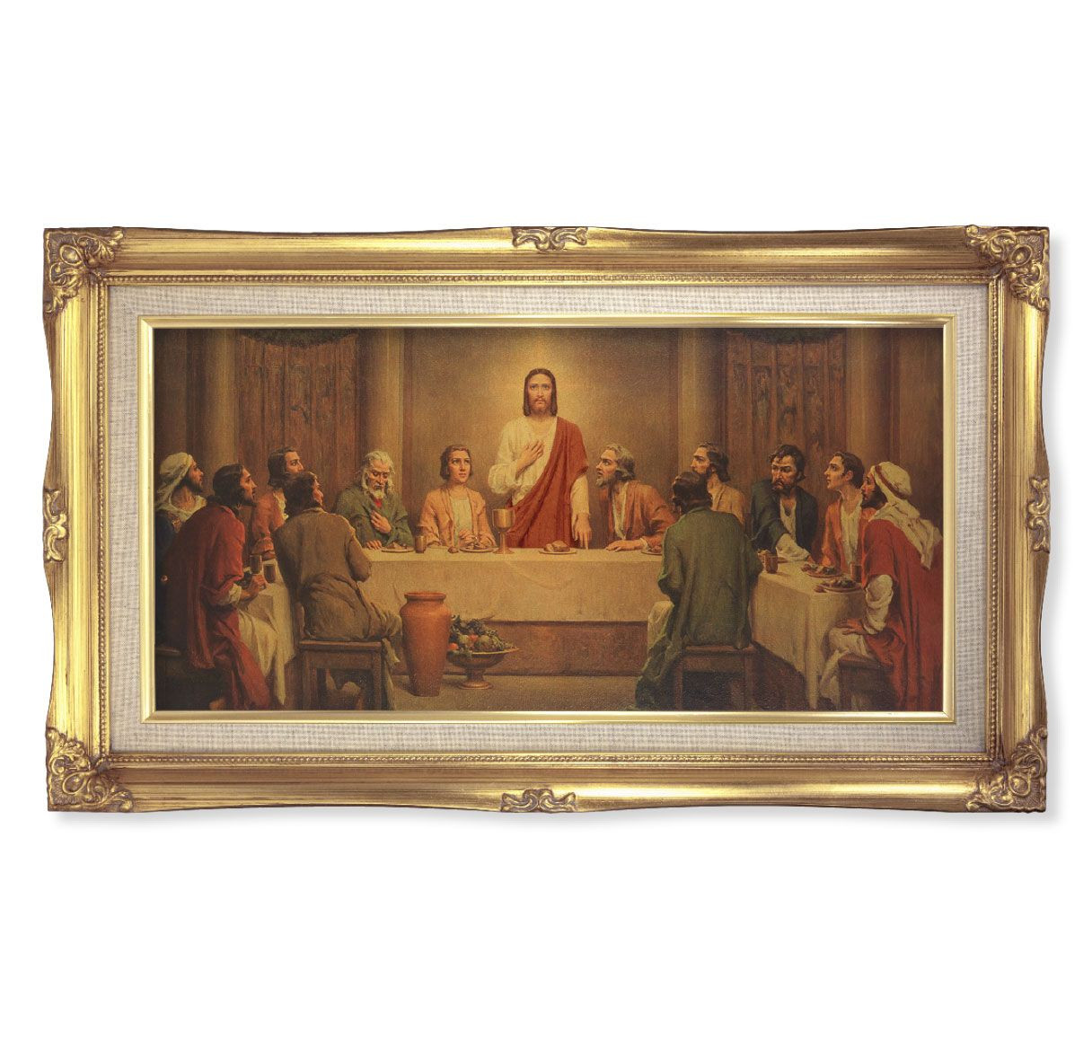 This beautifully framed Last Supper print brings sacred artistry and timeless elegance into your home. Printed in the USA and mounted within an ornate antique gold-leaf wood frame, the artwork is accented with curved detailing, acanthus-leaf tips, and a refined linen mat border. The result is a museum-quality presentation that enhances any wall it graces.