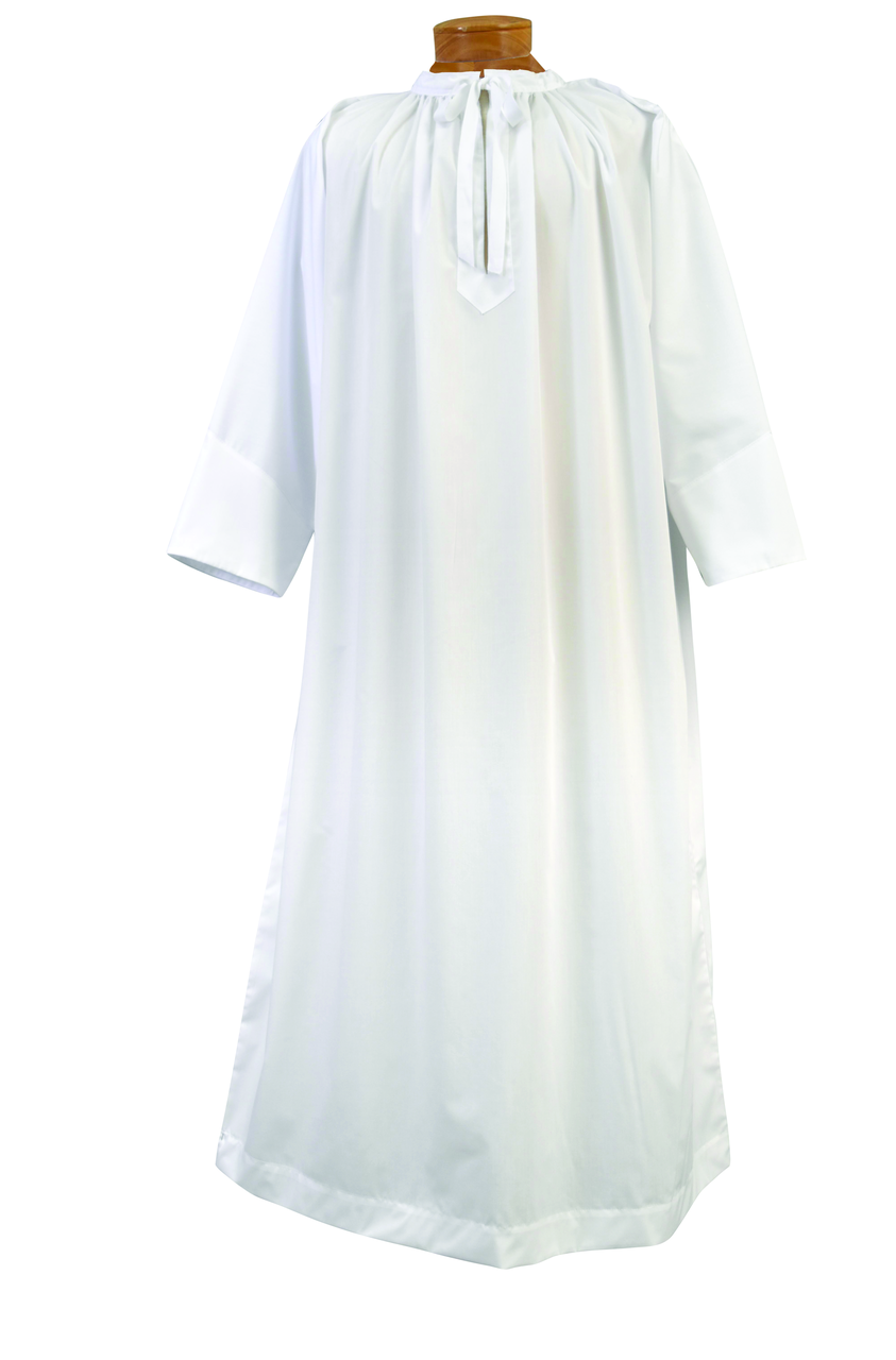 Traditional alb tailored in contemporary fabric. Perma press, 65% poly 35% combed cotton.