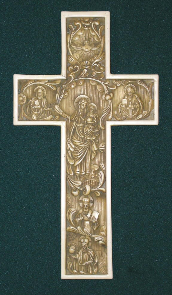 True Church Byzantine cross showing the Madonna and Child with the Holy Spirit above, Saints Peter and Paul at the sides and God The Father and God the Son at the bottom in antiqued alabaster, 12".
