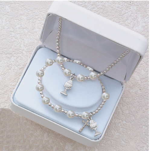 WHITE PEARL HEART RHODIUM CHALICE STRETCH BRACELET & PENDANT SET, BOXED